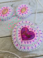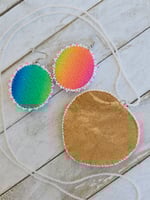 Both made with delica beads and AB Czech Preciosa rhinestone banding. Medallion backed with home tanned buckskin and earrings backed with faux leather. Medallion necklace is double strung with 8 lb weight Fire line thread for extra durability. Earrings measure approximately 1.75"x1.7" and medallion approximately 2.75"x2.8".
